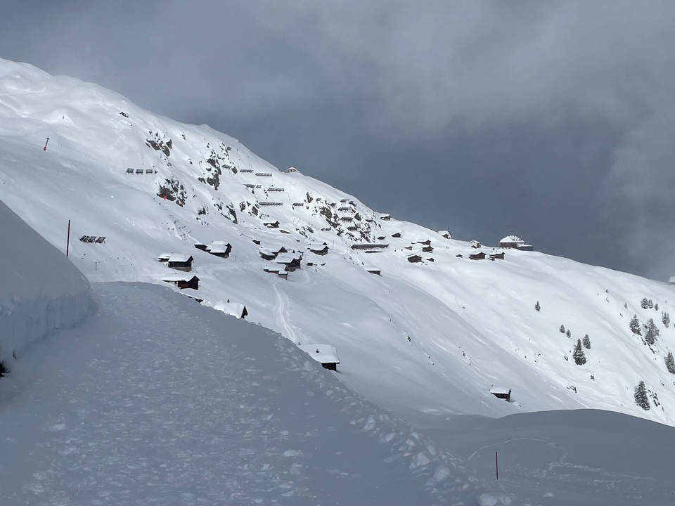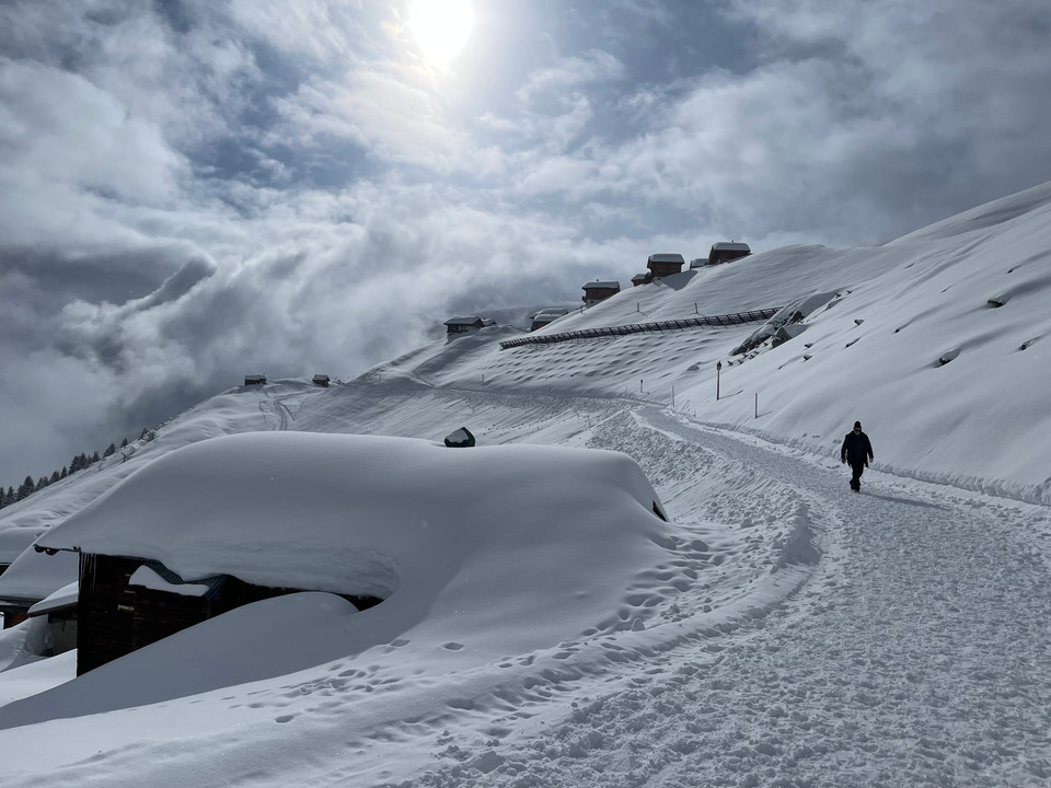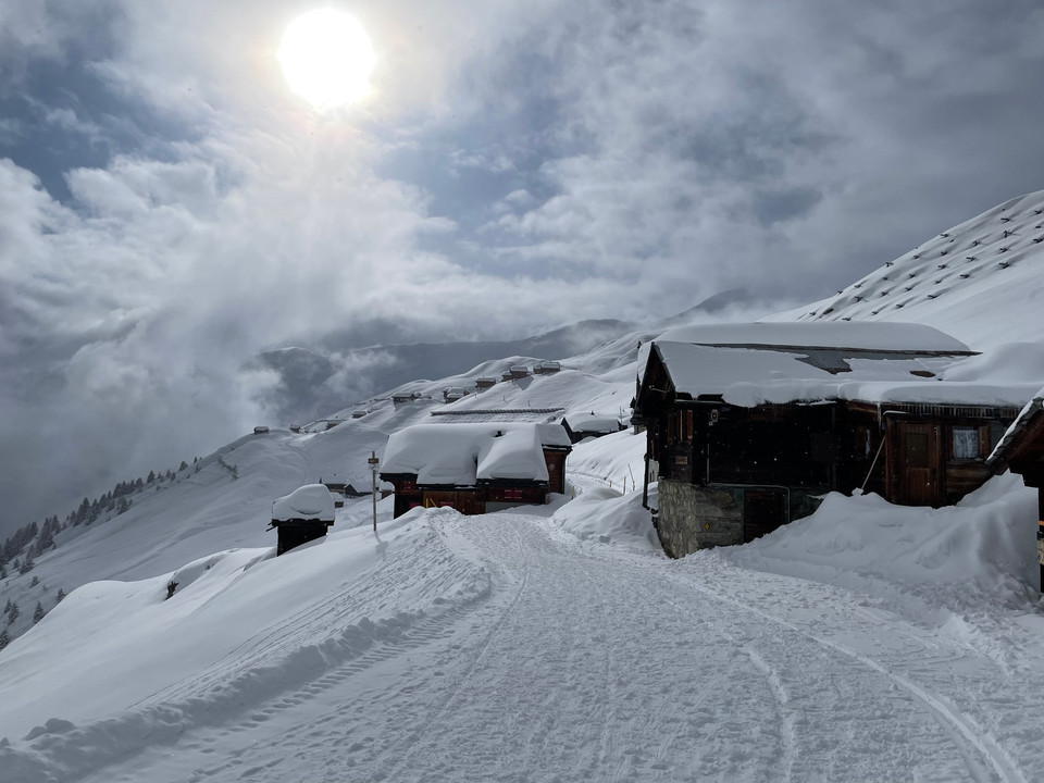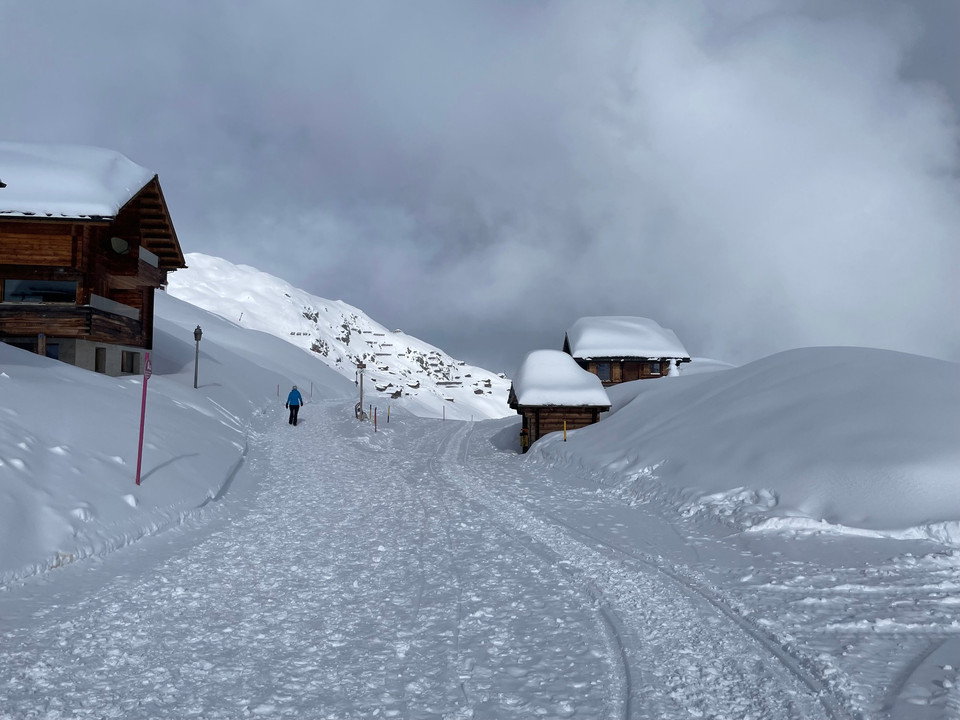 From the cable car mountain station (2094 metres above sea level), the route leads via Bruchegg and Hotel Belalp to the Aletschbord (2130 metres above sea level). Caution: skiers may approach between the cable car mountain station and Bruchegg.