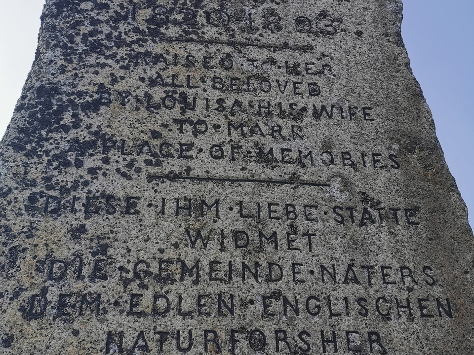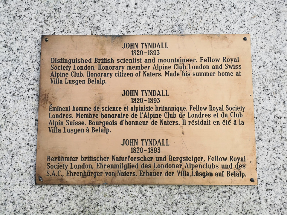 Die tiefe Zuneigung zu ihrem Gatten, die Schuldgefühle wegen seines tragischen Endes und die Verbundenheit mit der Belalp und seinen Bewohnern, dürften die Beweggründe für das steinerne Denkmal gewesen sein. John Tyndall (1820-1893) war ein irischer Physiker und Alpinist. Von 1861 bis zu seinem Tod verbrachte er die Sommer in den Schweizer Alpen, vornehmlich an seinem Lieblingsort, der Belalp.